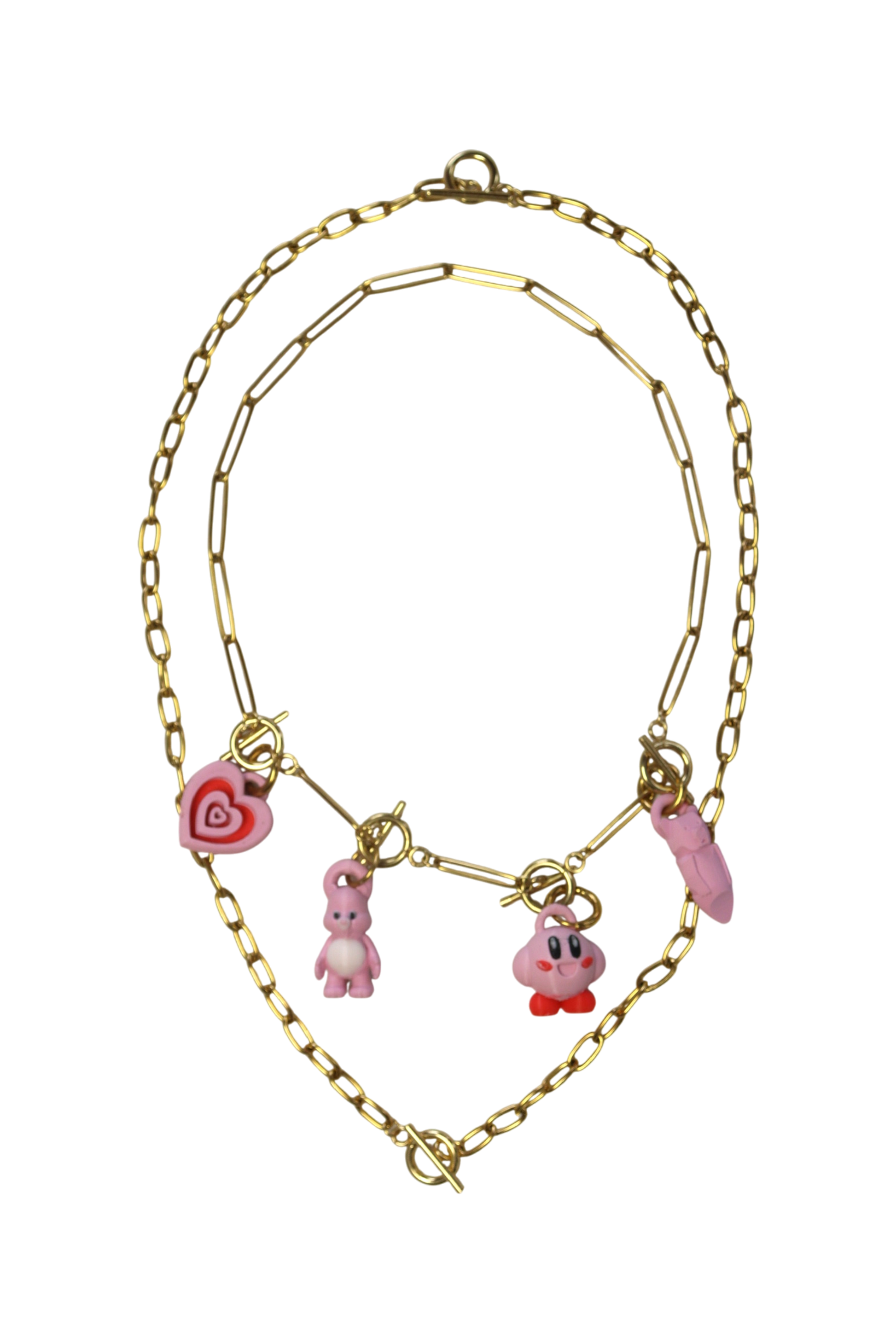 Si amas el rosado, este combo es para ti. Nuestra combinación de accesorios con cadena dorada y encantadores charms en tonos rosados llega lista para usar y elevar cualquier look.